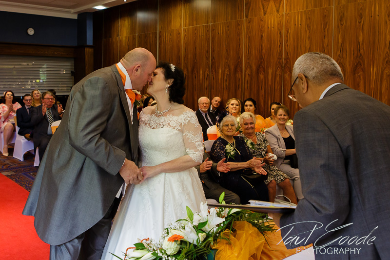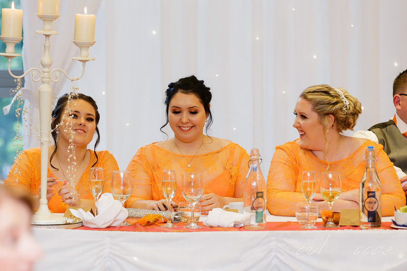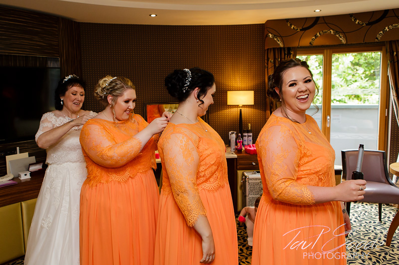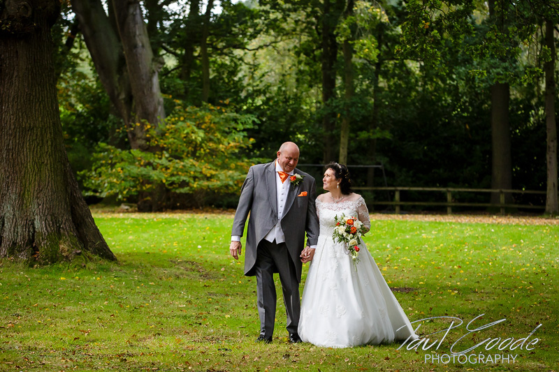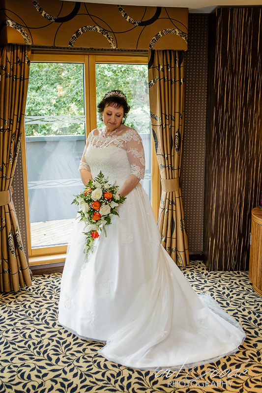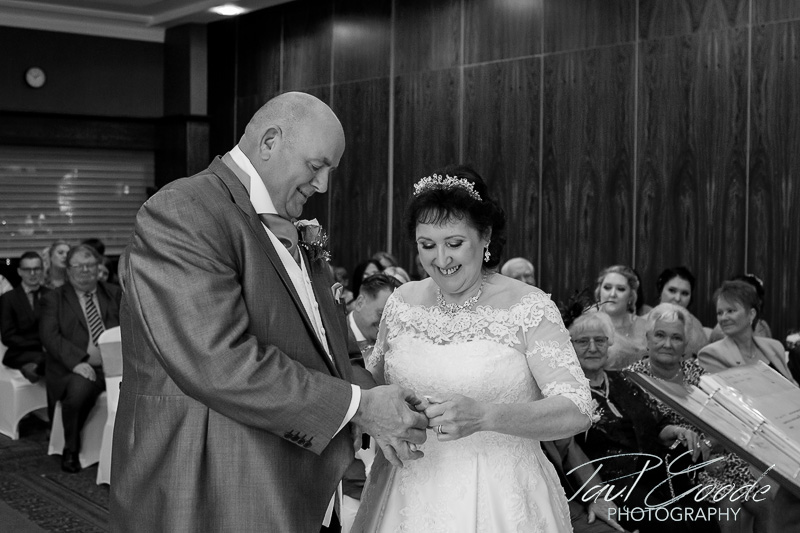 Sharon & the girls were enjoying the morning’s preparations in the Hotel’s very distinctive Bridal Suite & everybody was looking forward to the day ahead. Downstairs Mick & the guests were gathering in the Park View Suite for the ceremony. The Park View suite is a lovely room for a wedding ceremony with huge windows letting lots of daylight in & giving lovely views into the surrounding woodland. Soon it was time for Sharon to make her way through the hotel to the Park View Suite for the lovely wedding ceremony conducted by the Staffordshire Registrars.