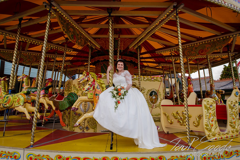 Following the ceremony the sun was shining so we all headed out into the hotel grounds for family photos & confetti throwing followed by a few photos of Sharon & Mick. Then it was onto the photographic highlight of the day as we took a golf buggy ride into the theme park for photos on the park’s beautiful carousel. A stop off alongside the lake gave us a last photo opportunity before we rejoined the guests for the wedding breakfast & fun of the speeches back in the Park View Suite.